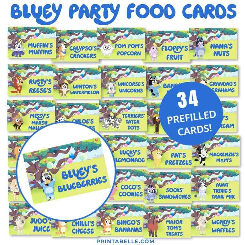 Make your Bluey party extra fun and organized with these adorable Bluey Food Cards! Featuring all your favorite Bluey characters, these pre-filled printable food labels are perfect for snack tables, treat stations, or party favors.