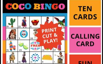 Fun Coco bingo game printable with 10 unique bingo cards, two to a page. Plus, a calling card. The cards are sized at two cards to a standard sized (8 1/2 x 11 inches) page and will be emailed to you within 12 hours of purchase! .