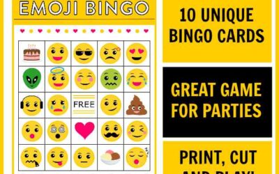 Emoji bingo game, includes ten unique bingo cards and one calling card page. The cards are sized at two cards to a standard sized (8 1/2 x 11 inches) page.