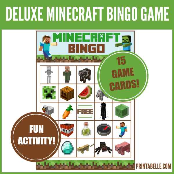 15 Minecraft printable bingo cards, plus a calling card. The cards are sized at two cards to a standard sized (8 1/2 x 11 inches) page.