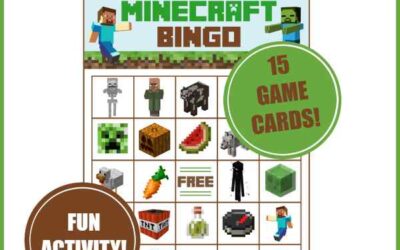 15 Minecraft printable bingo cards, plus a calling card. The cards are sized at two cards to a standard sized (8 1/2 x 11 inches) page.