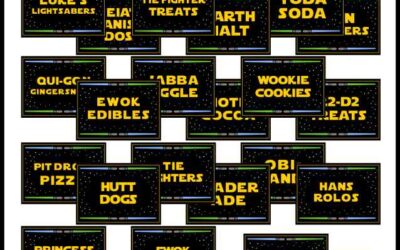 SIX pages of Star Wars printable PDF emailed party food cards, including: Hoth Cocoa, Leia’s Danish Dos, Yoda Soda, Jedi Juice, Obi-Wands, Darth Malt, R2-D2 Treats, Qui-Gon Gingersnaps, Vader Ade, Pit Droid Pizza, Han Burgers, Jabba Jiggle, Ewok Edibles, Luke’s Lightsabers, Tie Fighter Treats, Ewok Treats, Hans Rolos, Light Sabers, Hutt Dogs, Princess Lays, Thermal Detonators and Tie Fighters. Plus, a page of blank cards, too.